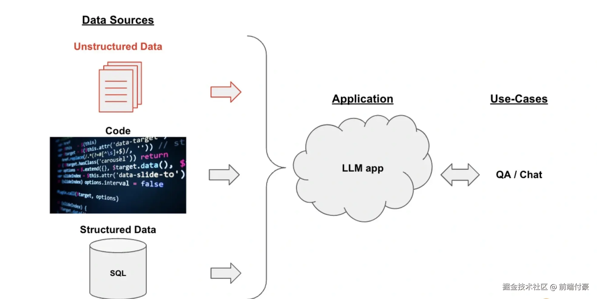 •数据源(DataSources):数据可以有很多种,包括PDF在内的非结构化的数据(Unstructured Data) s SQL在内的结构化的数据(Structured Data),以及Python、Java之类的代码(Code) o在这个示例中,我们 聚焦于对非结构化数据的处理。