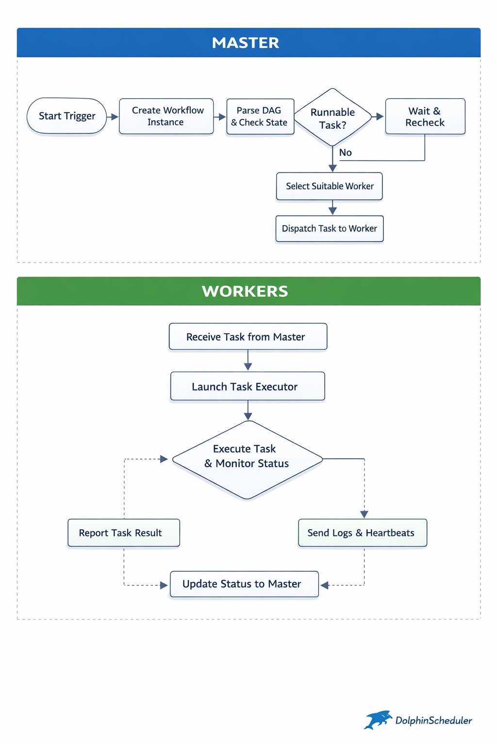 DolphinScheduler 通过强制解耦,把复杂性锁死在 Worker 侧: