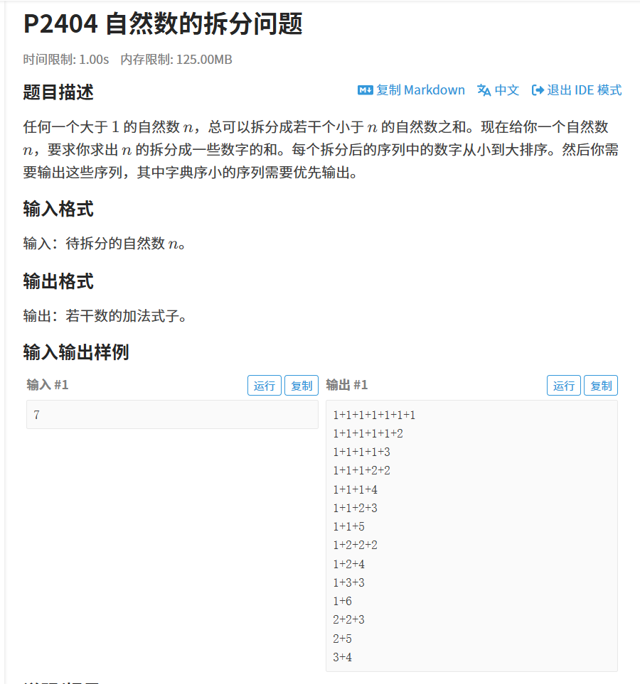就用7举例,7个1相加,最后第7个1加完之后,第八个1不满足for循环了,输出这次的结果,跳出来,回溯,pop_back第7个1,进行for循环,发现也不满足,继续回溯,回溯到第6个1,删除,for循环,发现2刚刚好,于是就把最后两个1换成2了,然后继续输出答案,以此类推