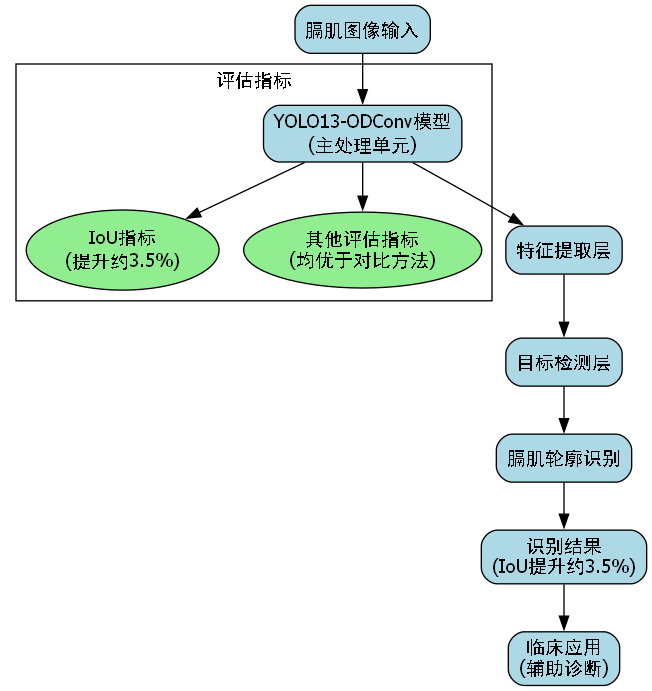 实验结果表明,YOLO13-ODConv模型在所有评估指标上均优于其他对比方法,特别是在IoU指标上提升了约3.5%,这对于临床应用具有重要意义,因为更高的IoU意味着更精确的膈肌轮廓识别。