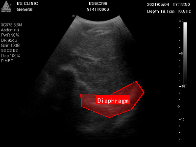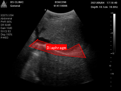 图1:膈肌超声影像示意图 - 展示膈肌在超声图像中的典型特征和测量方法