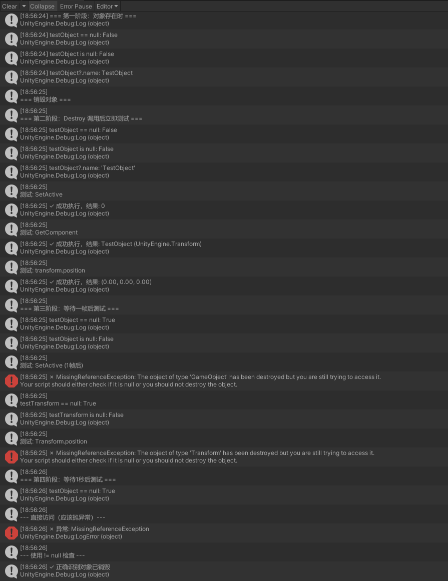 Debug.Log("=== 第一阶段:对象存在时 ===");