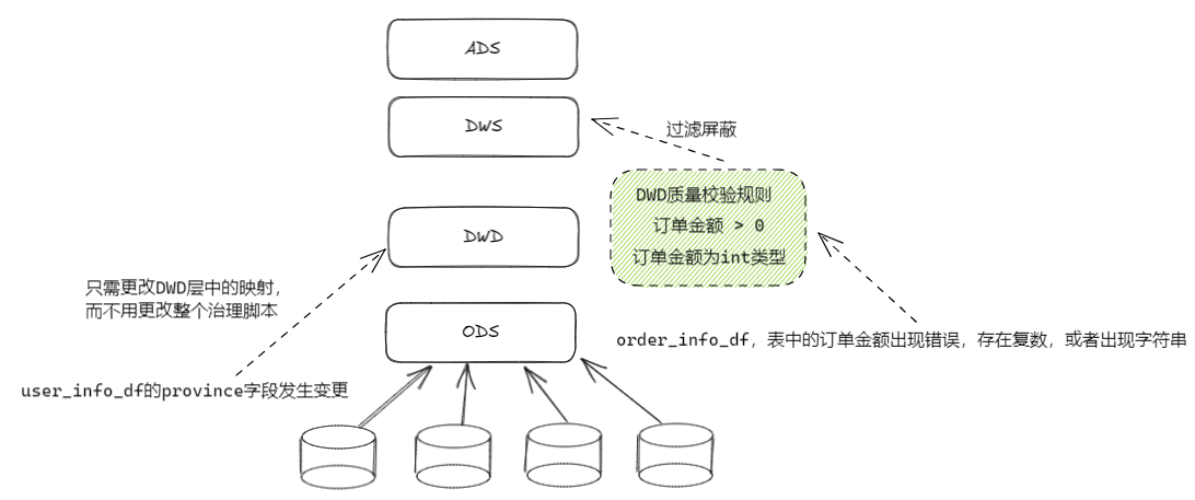 数仓通过ODS层和DWD层对上游业务进行了隔离和抽象,当上游数据发生变更(如表结构变更,字段更新等)其影响通常会被限制在数仓的底层,对于上游的应用以及数据分析师的使用这种下游的变更是趋向"无感"的,一定程度上提高了数仓的稳定性。如图1.4.1