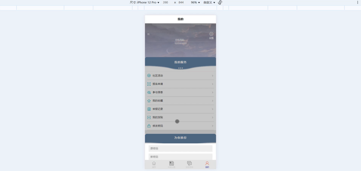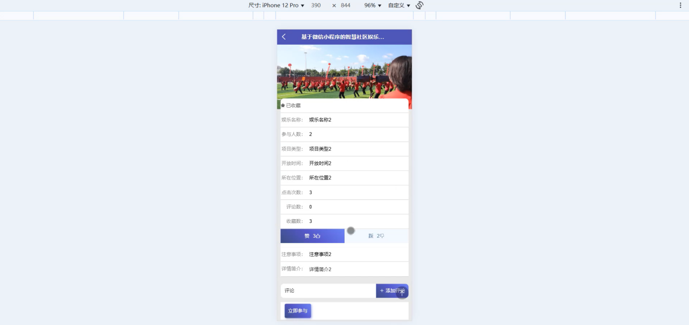 - 微信小程序用户端:首页个性化娱乐项目推荐(基于协同过滤算法);娱乐项目、社区活动详情查询,社区活动在线报名;社区公告浏览;社区互动(论坛发帖、评论、回复);个人中心(报名记录、收藏、我的发帖、举报记录等)。