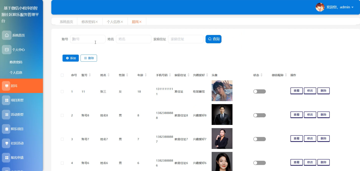 - 管理员端:居民信息管理(增删改查、审核注册);娱乐项目、社区活动管理(发布、编辑、删除、审核报名);社区论坛管理(审核帖子、处理违规内容);社区公告管理(发布、修改、删除);推荐算法运维、资讯管理等。