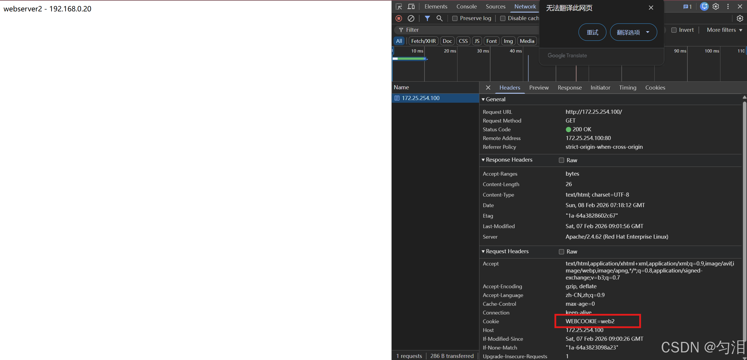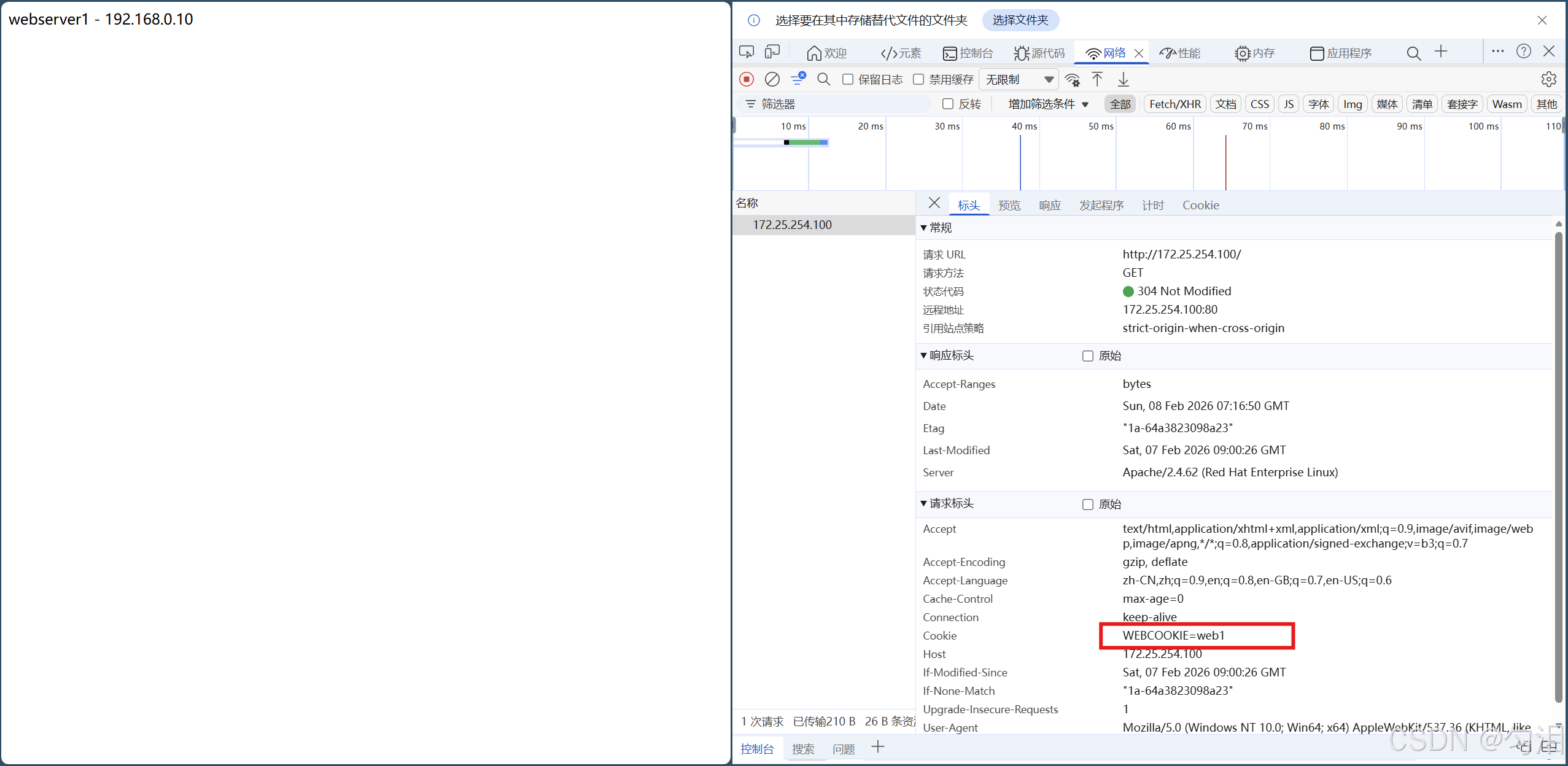 webcluster监听段,启用轮询(roundrobin)负载均衡,指定hash-type consistent,并通过cookie WEBCOOKIE insert nocache indirect插入 Cookie;为两台后端服务器(192.168.0.10/20)分别配置cookie web1/web2标识,同时设置健康检查参数(如check inter 3s)和权重。 - 验证效果:分别用 Firefox 和 Edge 浏览器访问,验证不同浏览器会被分配到不同的后端服务器,同一浏览器则持续访问同一服务器。