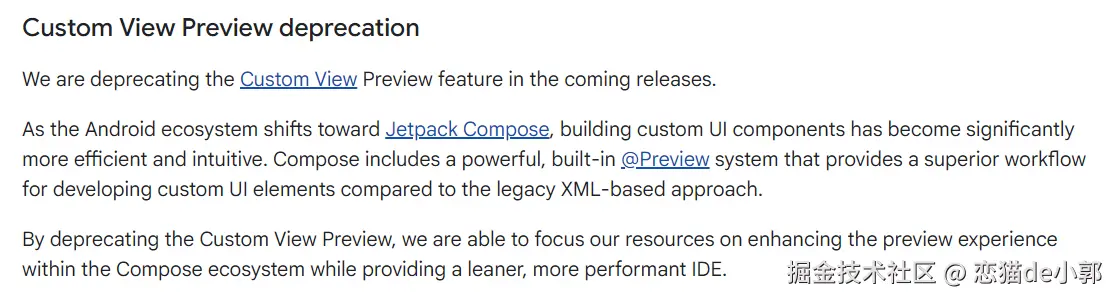 随着 Android 生态系统向 Jetpack Compose 过渡,构建自定义 UI 组件变得更加高效和直观,并且 Compose 内置了强大的 @Preview 系统,与传统的基于 XML 的方法相比,它为开发自定义 UI 元素提供了更优的工作流程,通过弃用自定义视图预览,官方可以将资源集中用于增强 Compose 生态系统中的预览体验,说人话就是:XML 的不再维护了。