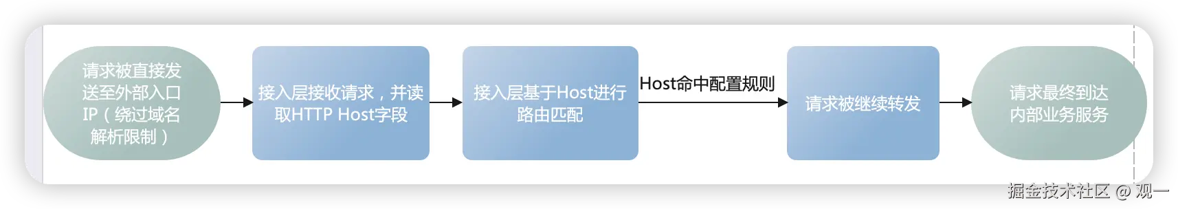 在 Host 碰撞场景下,攻击者直接访问的是入口 IP 本身 ,并通过 HTTP 请求头中的 Host 字段指定目标域名。