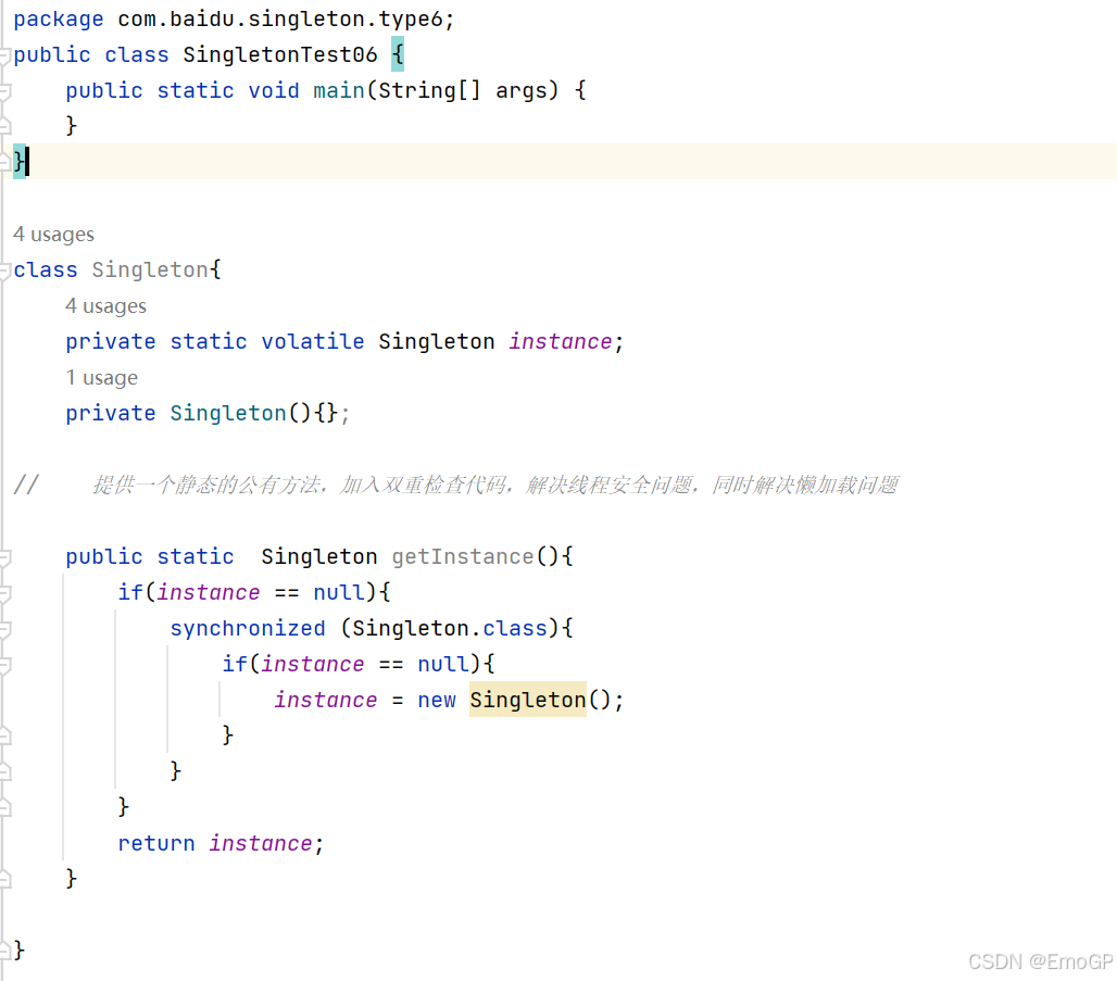 2 这样,实例化代码只用执行一次,后面再次访问时,判断if(singleton == null),直接return实例化对象,也避免的反复进行方法同步