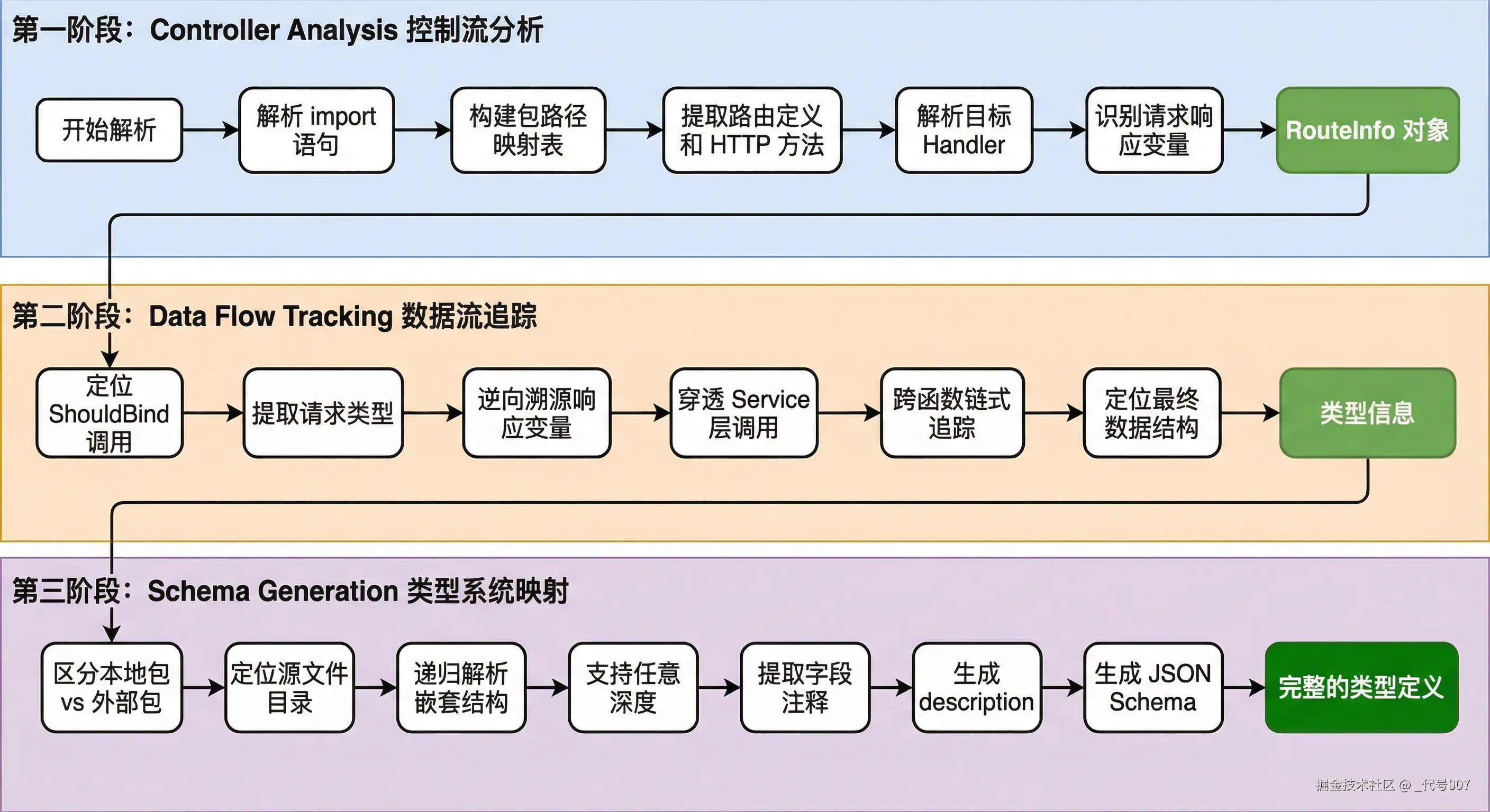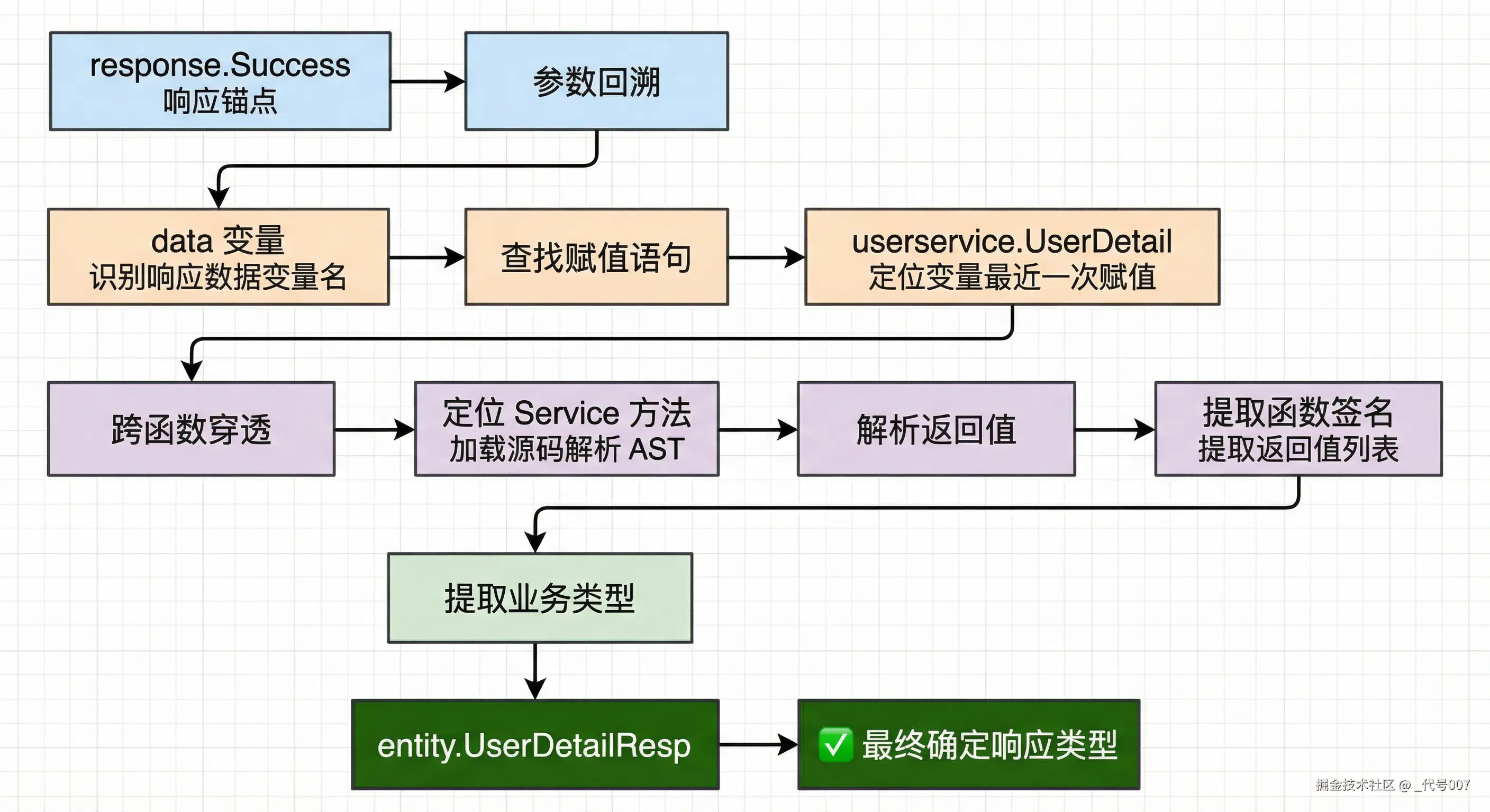 响应结构的提取最具挑战性,因为 Go 的灵活性允许直接赋值、函数调用返回、链式调用等多种写法。我们设计了一套逆向溯源算法: