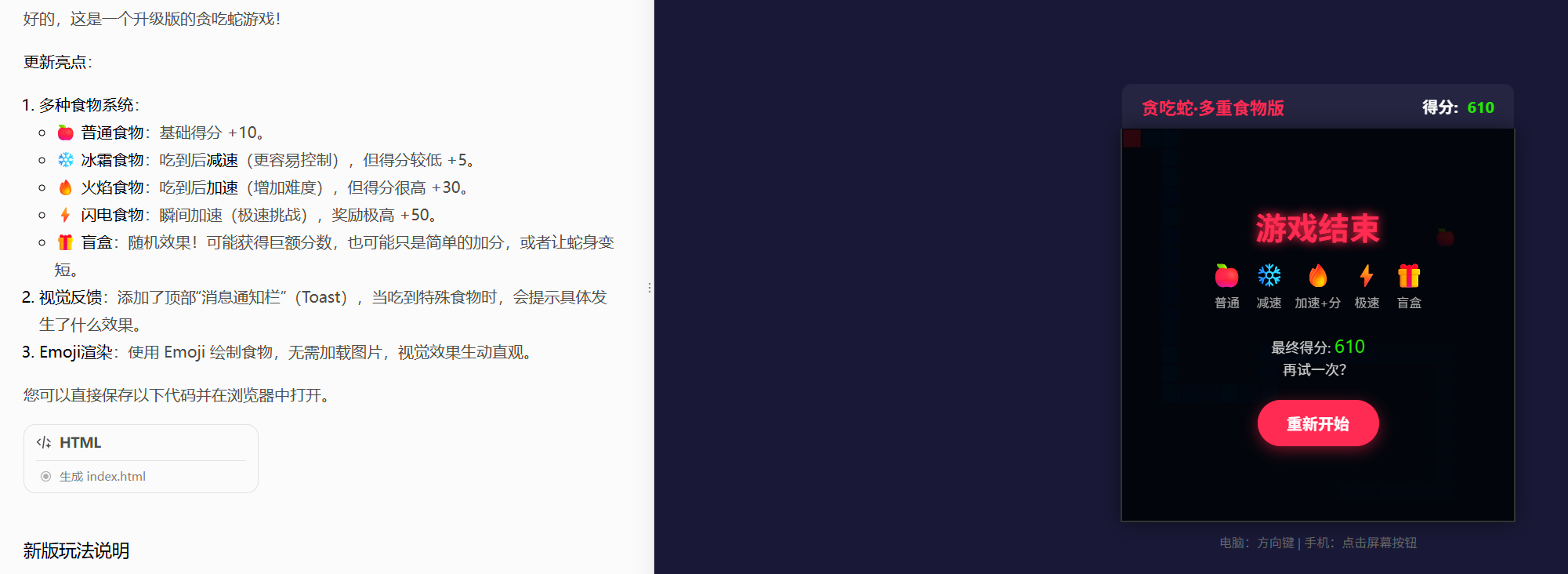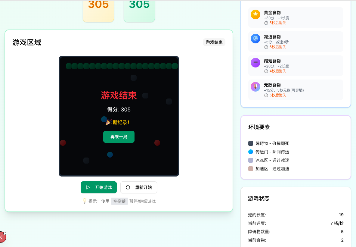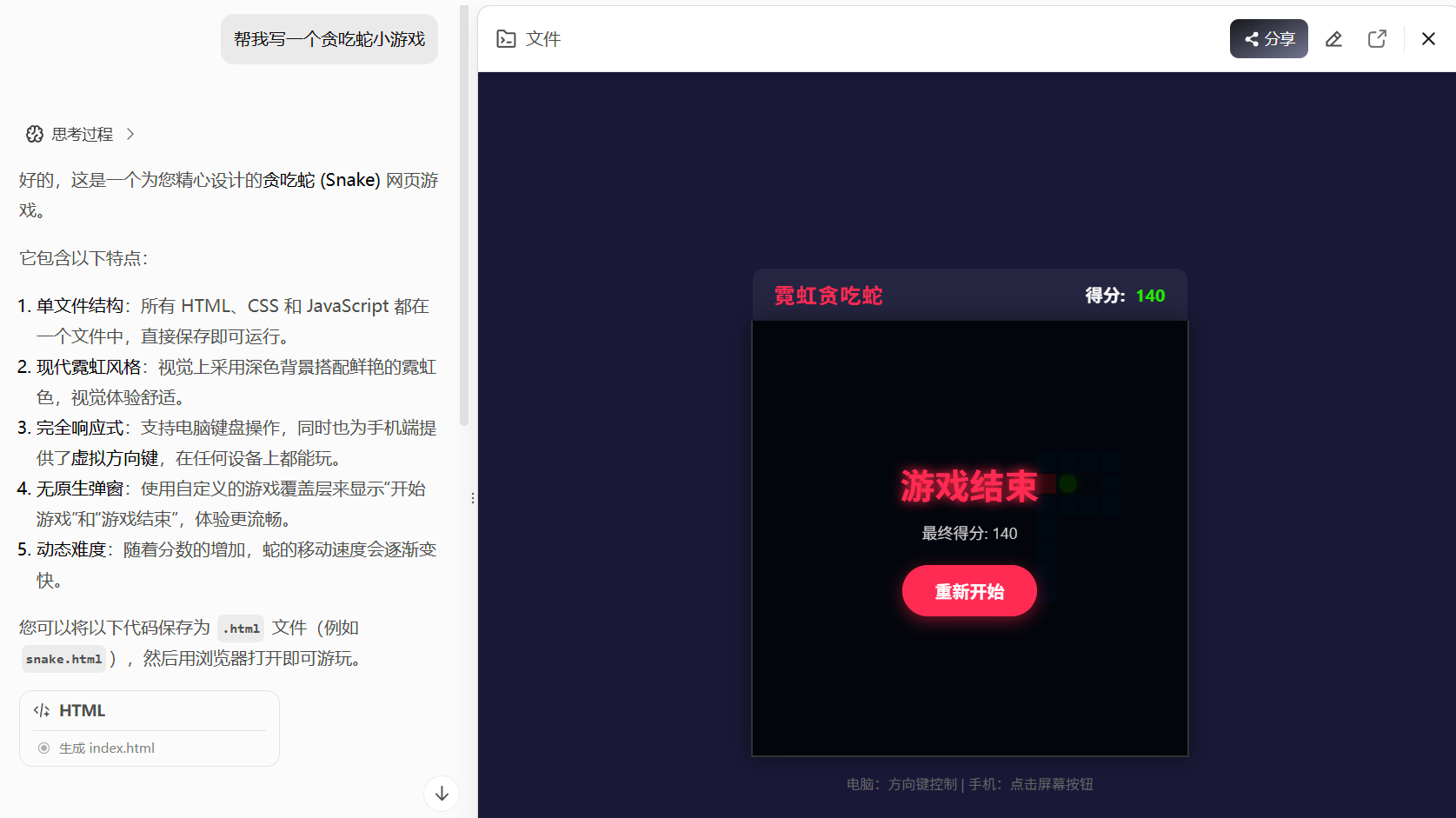 - 尝试使用AI工具跟着教程,编写一个贪吃蛇游戏,并进行测试;