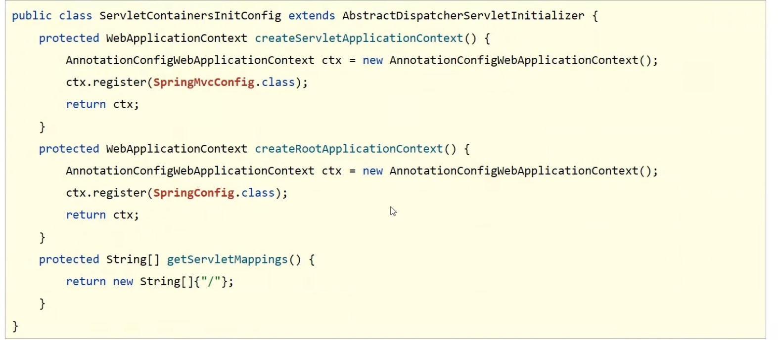 public class ServletContainersInitConfig extends AbstractDispatcherServletInitializer {protected WebApplicationContext createServletApplicationContext(),初始化容器并注册配置类 {AnnotationConfigWebApplicationContext ctx = new AnnotationConfigWebApplicationContext();ctx.register(SpringMvcConfig.class);