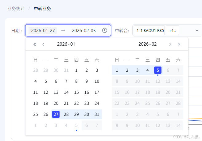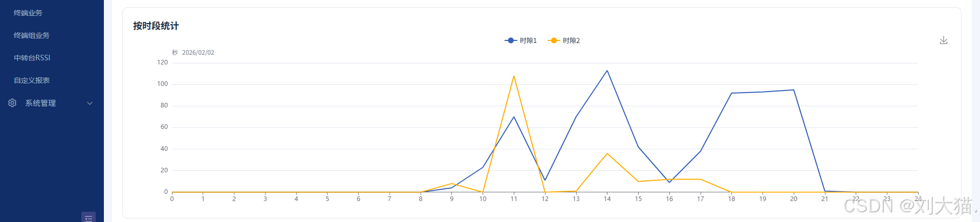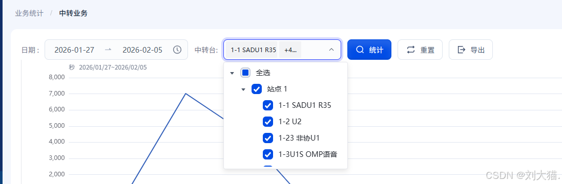 - 按日期统计:左侧通过折线图说明此时间段内该中转台时隙1和时隙2的使用情况;右侧通过环状图说明此时间段内该中转台处理各类业务的时间占比。