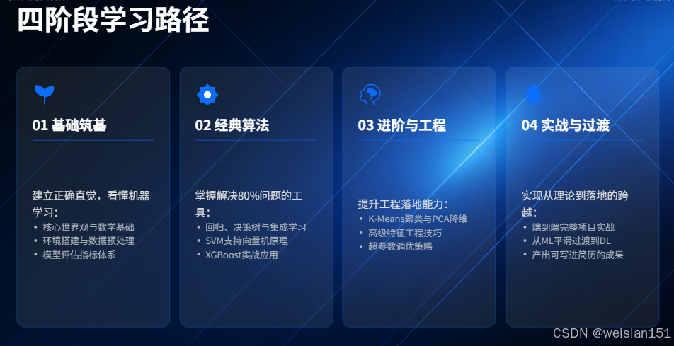 学习机器学习最怕"东一榔头西一棒槌"。为此,我为你设计了一条系统、渐进、实战导向的四阶段学习路径。每一步都聚焦核心能力,避免无效内卷,确保学有所用。
