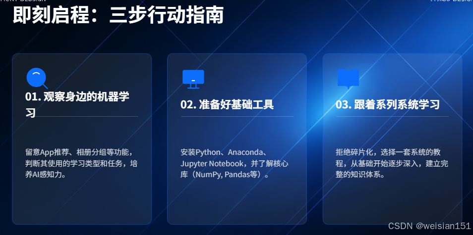 更值得庆幸的是,机器学习领域仍在飞速迭代、持续发展,没有所谓的"太晚",也没有所谓的"门槛过高",你现在迈出第一步,就是最好的时候。不用怕自己零基础,不用怕看不懂算法,不用怕写不好代码,这套路线会陪着你,一步一个脚印,从"看懂"到"会用",从"会用"到"能落地"。