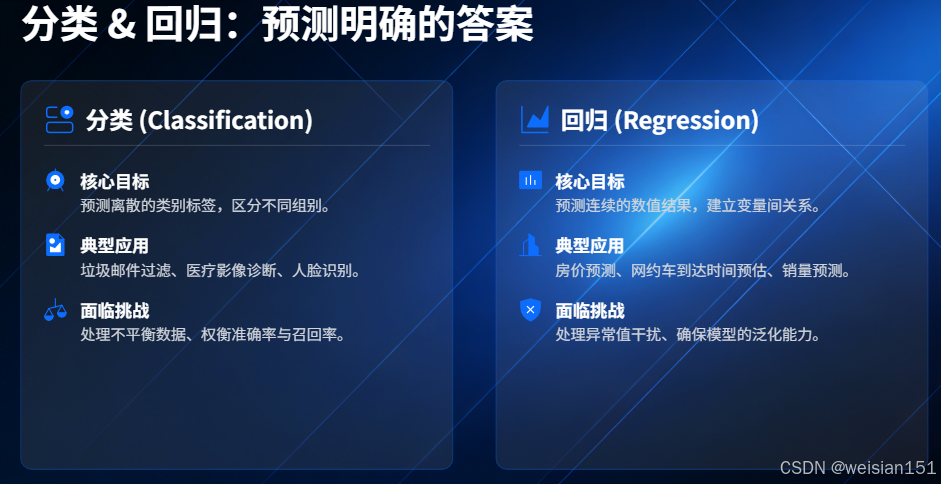 👉 例如:判断邮件是否为垃圾邮件、识别医学影像中的病变、验证人脸身份 - 回归(Regression) :预测连续的数值结果