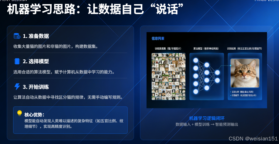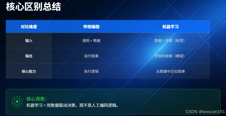 ✅ 一句话记住:机器学习 = 用数据驱动决策,而不是人工编码逻辑。