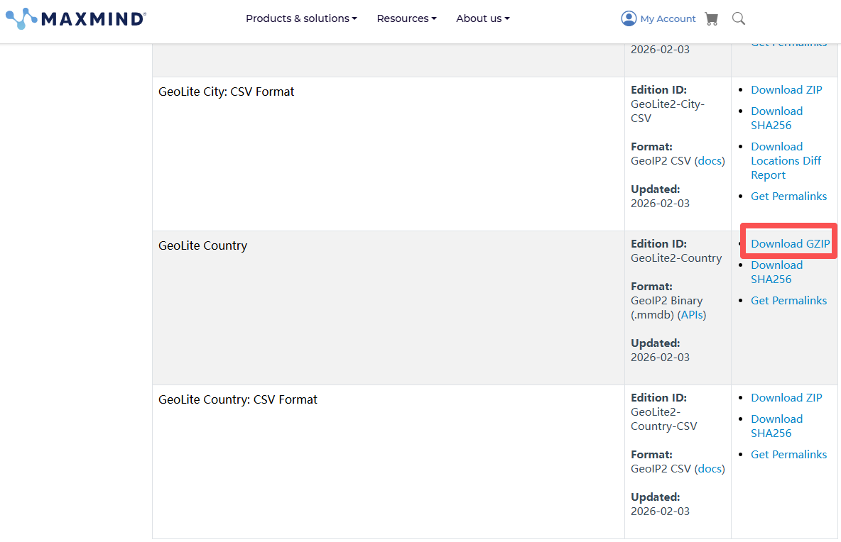 下载地址:https://www.maxmind.com/en/accounts/1293507/geoip/downloads