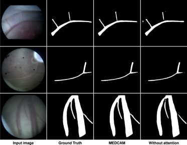 图10. MEDCAM模块对胎盘血管分割影响的定性比较。每行显示一个测试集示例。输入图像、真值、MEDCAM和无注意力模块的结果分别从左到右呈现。