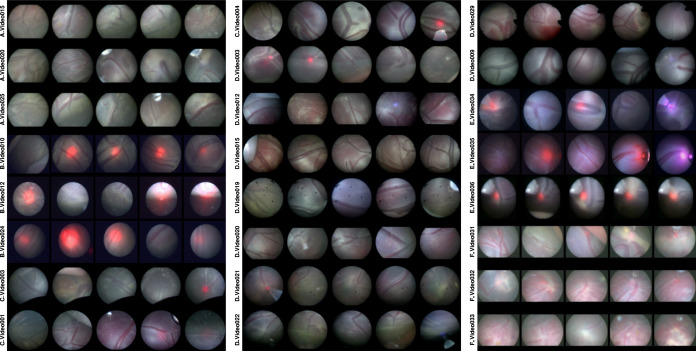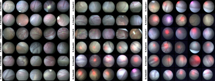 图8. 来自A中心和B中心训练集的代表性视频帧。每行展示从单个视频中提取的五个连续数据样本。总共展示了来自18项独立体内TTTS手术的90个视频帧。