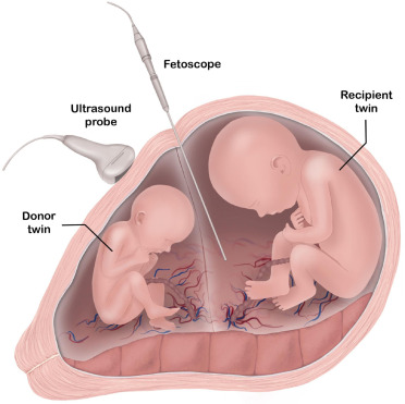 图1. 双胎输血综合征(TTTS)胎儿镜激光光凝术(FLP)概述。图中显示了双胞胎胎儿,各自位于羊膜囊内。单绒毛膜双胎妊娠的特点是共享一个胎盘,通常存在血管连接,允许双胞胎之间进行血液交换。胎儿镜用于检查胎盘血管,并寻找导致血液交换不平衡的病理性连接。当识别出此类连接时,使用激光凝固它们。通常使用超声探头引导胎儿镜的插入。