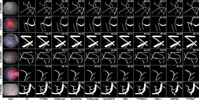 图11. 在测试集上获得的我们提出的TTTSNet模型与几种最先进方法以及两种基于TTTSNet的配置的分割结果示例。GT是真值(Ground Truth)的缩写。TTTSNetâ˜...表示在FetReg2021挑战赛提供的原始像素级标注上训练的TTTSNet。图像按最佳总分从左到右排列。每行对应一个不同的视频,每列显示输入图像、真值、TTTSNet结果以及其他最先进方法的结果。