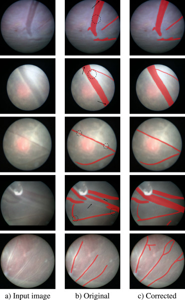 图7. 修正标注的示例:输入(左)、原始标注(中)和修正标注(右)。虚线圆圈强调了不准确的标注,箭头指出了标注不一致之处,例如超出视野范围或未贴合边缘的标注。第一行展示了一个未能填补空隙的标注。第二行强调了胎盘血管边缘描绘不准确的情况。第三行展示了羊膜囊颗粒伪影导致的血管不连续标注。第四行显示了遗漏的大胎盘血管。最后,最后一行展示了遗漏的小胎盘血管。