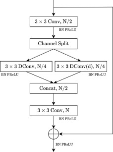 图4. SEM-B结构的架构。SEM-B首先通过一个3×3卷积(Conv)来提取特征图并将输入通道数减半。此卷积的输出随后被分成两个分支,分别由深度可分离卷积(DConv)和深度空洞卷积(DConv(d))组成。为了融合多尺度特征图,使用一个3×3卷积。在每次卷积操作后都应用批量归一化(BN)和PReLU激活函数。模块的输出将最后一个卷积层的输出与输入特征图的恒等映射进行拼接。N和⊕分别表示特征通道数和拼接操作。
