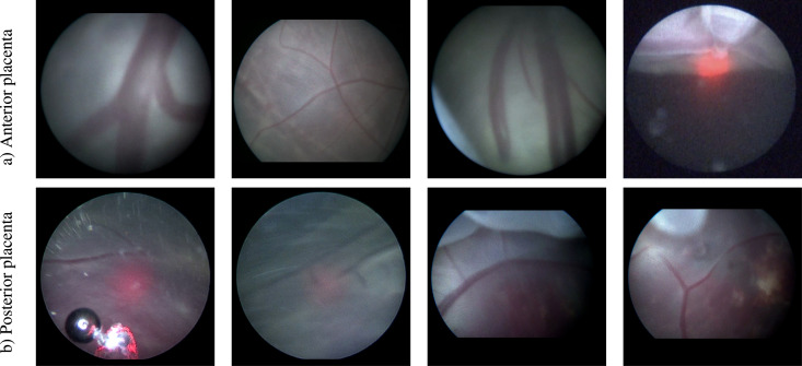 图13. 两种胎盘类型(a)前壁和(b)后壁胎盘的视频帧示例。我们展示了前壁胎盘病例在视野内表现出比后壁胎盘病例更好的胎盘血管可见性,这影响了两种类型的分割性能。