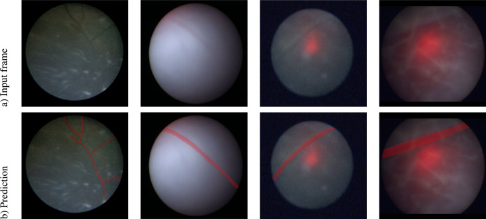 图12. 视频帧中可见度差的示例及其对应的胎盘血管叠加预测掩膜。第一行显示输入视频帧,第二行显示胎盘血管的叠加预测掩膜。在此,我们展示了基于深度学习的模型如何改善胎盘血管的可见性,以辅助胎儿外科医生进行TTTS胎儿镜手术。