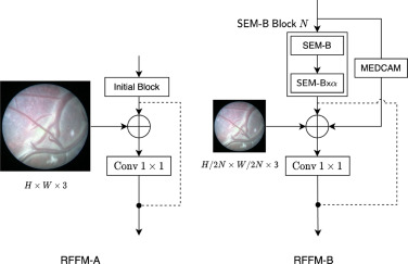 图3. 提出的RFFM保留了恒等函数,以帮助模型学习复杂特征而不增加模型参数数量。在RFFM-A中,我们将输入块特征的恒等路径与原始图像和初始块的拼接特征进行1×1卷积处理。在RFFM-B中,处理后的输入特征图与SEM-B的输出、下采样的原始图像、MEDCAM的输出以及输入特征图的残差连接进行拼接。虚线框中的SEM-B Block N包含(α+ 1)个SEM-B,其中N对应块1或块2。
