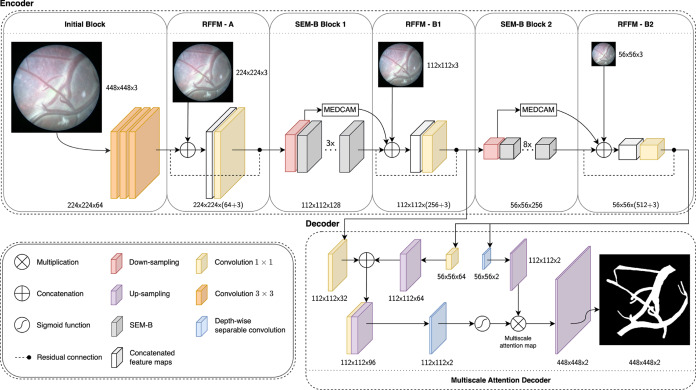 图2. TTTSNet网络架构概述,用于双胎输血综合征(TTTS)胎儿镜激光手术期间的胎盘血管实时分割。TTTSNet设计为非对称编码-解码神经网络,接收三通道RGB输入图像并输出二进制分割图。在编码器部分,TTTSNet由初始块(Initial Block)、残差特征融合模块(RFFM)块和分割-提取-合并瓶颈(SEM-B)块组成,其中包括一种称为最大池化通道注意力机制(MEDCAM)的通道注意力机制。编码器部分允许以低计算复杂度和少量模型参数高效快速地提取上下文特征。在RFFM模块中,虚线前的符号表示残差连接,有助于模型学习复杂特征而无需增加模型参数。在解码器部分,我们使用轻量级多尺度注意力解码器(MAD)。MAD及其多尺度注意力机制,通过使用最少数量的参数,使解码器能够有效地恢复空间特征表示。