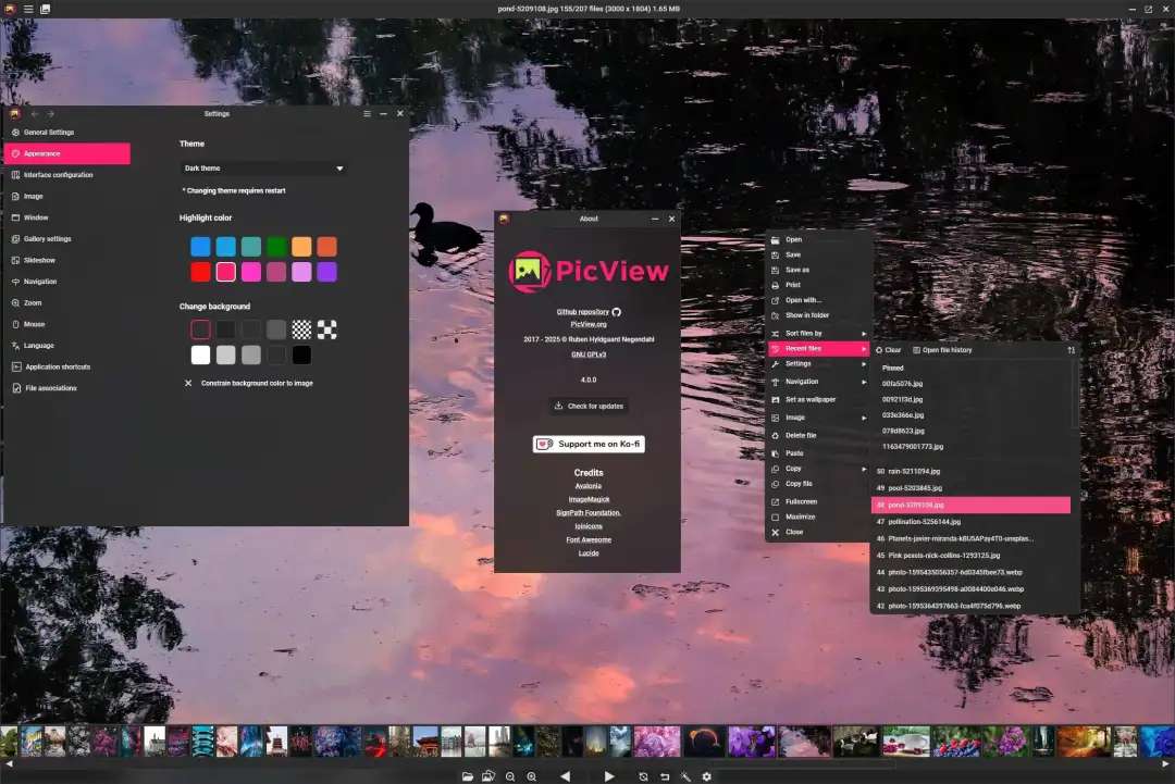 项目简介: PicView 是一款基于 .NET Avalonia 的开源免费、快速、可高度定制、跨平台的图片查看器,支持 macOS 和 Windows 10/11 操作系统。它支持几乎所有常见的图像文件类型,包括但不限于 (animated)WEBP、(animated)GIF、SVG、AVIF、HEIC、PSD 等,为用户提供了一个清洁、无干扰且高效的图片浏览体验。