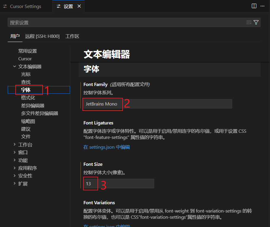 cursor中字体分为三个区域,可以按需单独设置三次。