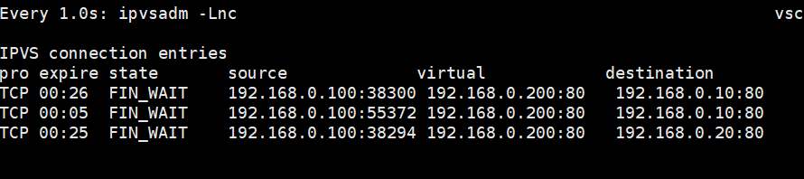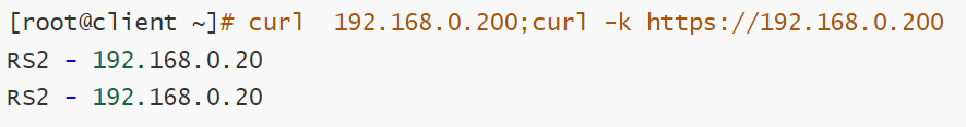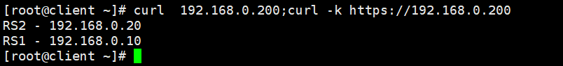 root@RS1+RS2 \~\]# dnf install mod_ssl -y \[root@RS1+RS2 \~\]# systemctl restart httpd \[root@RS1+RS2 \~\]# systemctl restart httpd 2.在vsnode中添加https的轮询策略 root@vsnode boot\]# ip\^Cadm -A -t 192.168.0.200:80 -s rr \[root@vsnode boot\]# ipvsadm -a -t 192.168.0.200:80 -r 192.168.0.20 -g \[root@vsnode boot\]# ipvsadm -a -t 192.168.0.200:80 -r 192.168.0.10 -g \[root@vsnode boot\]# ipvsadm -A -t 192.168.0.200:443 -s rr \[root@vsnode boot\]# ipvsadm -a -t 192.168.0.200:443 -r 192.168.0.10:443 -g \[root@vsnode boot\]# ipvsadm -a -t 192.168.0.200:443 -r 192.168.0.20:443 -g  3.轮询错误展示  #当上述设定完成后http和https是独立的service,轮询会出现重复问题 解决方案:使用火墙标记访问vip的80和443的所有数据包,设定标记为6666,然后对此标记进行负载 \[root@vsnode boot\]# iptables -t mangle -A PREROUTING -d 192.168.0.200 -p tcp -m multiport --dports 80,443 -j MARK --set-mark 6666 \[root@vsnode boot\]# ipvsadm -A -f 6666 -s rr \[root@vsnode boot\]# ipvsadm -a -f 6666 -r 192.168.0.10 -g \[root@vsnode boot\]# ipvsadm -a -f 6666 -r 192.168.0.20 -g #测试:在客户端 \[root@client \~\]# curl 192.168.0.200;curl -k https://192.168.0.200  4.利用持久连接实现会话粘滞 在我们客户上网过程中有很多情况下需要和服务器进行交互,客户需要提交响应信息给服务器,如果单纯的进行调度会导致客户填写的表单丢失,为了解决这个问题我们可以用sh算法,但是sh算法比较简单粗暴,可能会导致调度失衡 解决方案 在进行调度时,不管用什么算法,只要相同源过来的数据包我们就把他的访问记录在内存中,也就是把这个源的主机调度到了那个RS上 如果在短期(默认360S)内同源再来访问我仍然按照内存中记录的调度信息,把这个源的访问还调度到同一台RS上。 如果过了比较长的时间(默认最长时间360s)同源访问再次来访,那么就会被调度到其他的RS 1.设定ipvs调度策略 \[root@vsnode \~\]# ipvsadm -A -f 6666 -s rr -p 1 \[root@vsnode \~\]# ipvsadm -Ln IP Virtual Server version 1.2.1 (size=4096) Prot LocalAddress:Port Scheduler Flags -\> RemoteAddress:Port Forward Weight ActiveConn InActConn FWM 6666 rr persistent 1 -\> 192.168.0.10:0 Route 1 0 0 -\> 192.168.0.20:0 2,测试: \[root@client \~\]# curl 192.168.0.200 RS1 - 192.168.0.10 \[root@client \~\]# curl 192.168.0.200 RS1 - 192.168.0.10 3.观察 \[root@vsnode \~\]# watch -n 1 ipvsadm -Lnc
