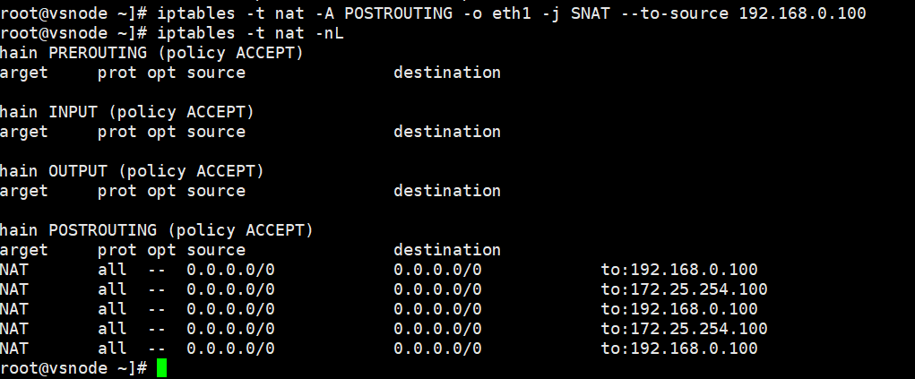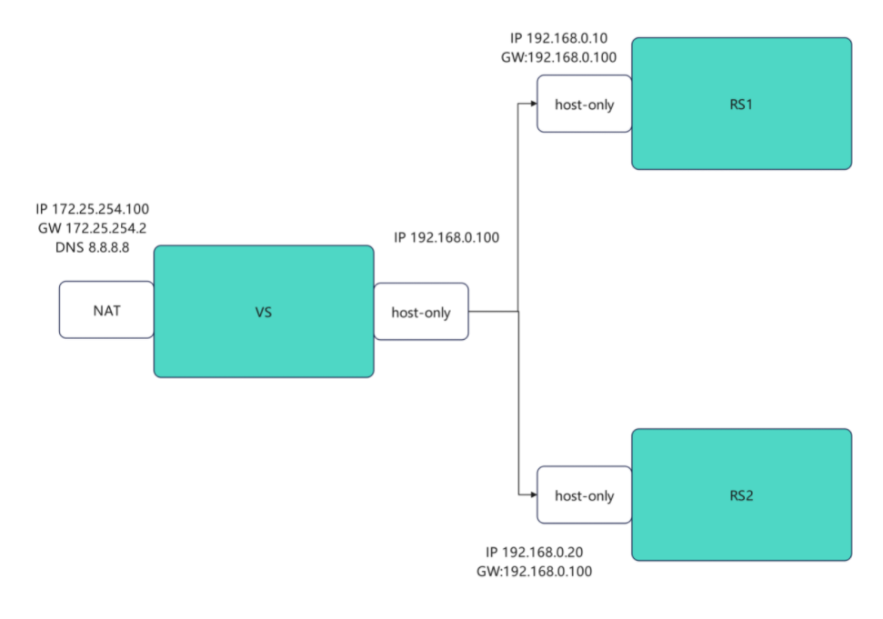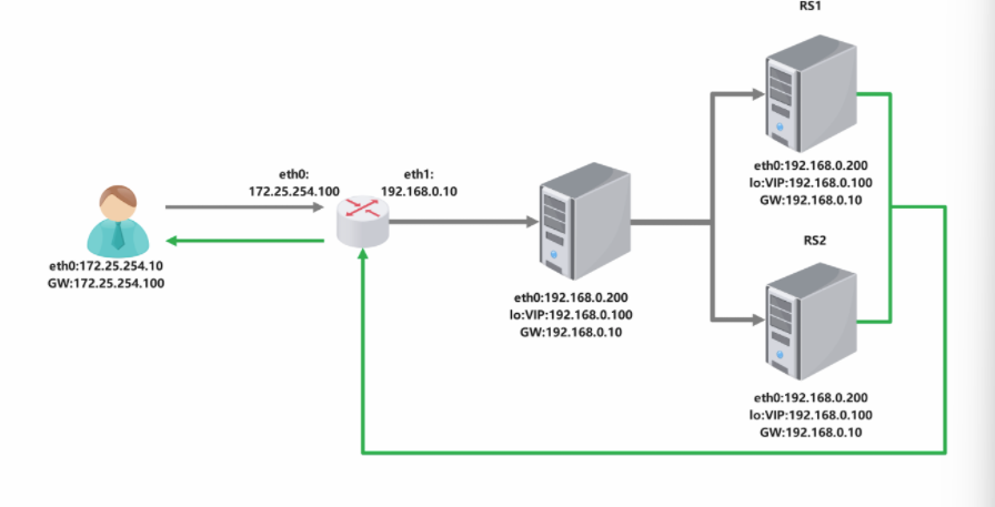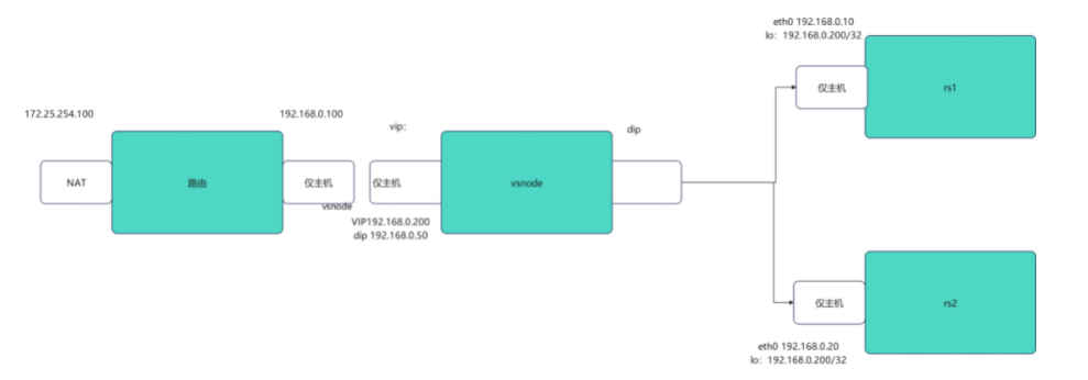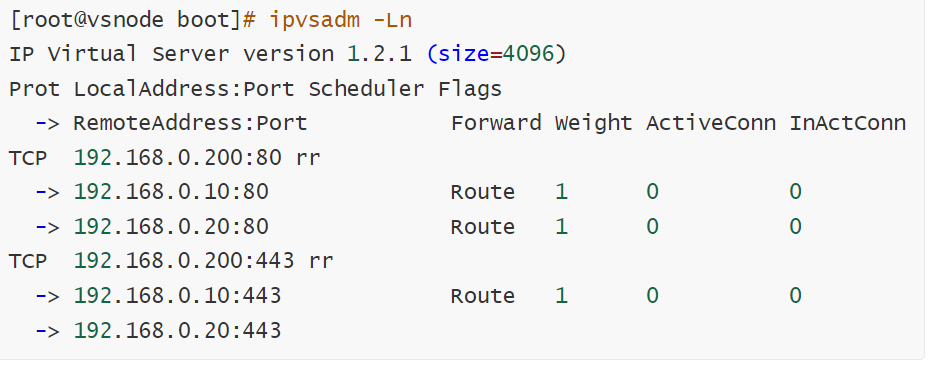 root@DR-server \~\]# ipvsadm -Ln --rate IP Virtual Server version 1.2.1 (size=4096) Prot LocalAddress:Port CPS InPPS OutPPS InBPS OutBPS -\> RemoteAddress:Port TCP 172.25.254.100:80 0 0 0 0 0 -\> 192.168.0.30:80 0 0 0 0 0 -\> 192.168.0.40:80 0 0 0 0 0 #CPS: 每秒连接数,表示服务器处理新连接的速率 #InPPS:每秒入站数据包数量,即从客户端发送到负载均衡器的数据包速率 #OutPPS: 每秒出站数据包数量,即从负载均衡器向后端服务器或客户端发送数据包的速率 #InBPS:每秒入站流量(字节),即从客户端到服务器的流量速率。 #OutBPS:每秒出站流量(字节),即从服务器到客户端的流量速率。 \[root@DR-server \~\]# ipvsadm -Z -t 172.25.254.20:80 \[root@DR-server \~\]# ipvsadm -Ln --rate IP Virtual Server version 1.2.1 (size=4096) Prot LocalAddress:Port CPS InPPS OutPPS InBPS OutBPS -\> RemoteAddress:Port TCP 172.25.254.20:80 0 0 0 0 0 -\> 192.168.0.30:80 0 0 0 0 0 -\> 192.168.0.40:80 0 0 0 0 0 #清空策略 ipvsadm -C pvs规则:/proc/net/ip_vs ipvs连接:/proc/net/ip_vs_conn 八、实战实验 1.nat模式下的环境设定  在VS主机中 \[root@vsnode \~\]# vmset.sh eth0 172.25.254.100 vsnode \[root@vsnode \~\]# vmset.sh eth1 192.168.0.100 vsnode noroute 在RS1中 #设定网络 \[root@RS1 \~\]# vmset.sh eth0 192.168.0.10 RS1 noroute \[root@RS1 \~\]# nmcli connection modify eth0 ipv4.gateway 192.168.0.100 \[root@RS1 \~\]# nmcli connection reload \[root@RS1 \~\]# nmcli connection up eth0 \[root@RS1 \~\]# route -n Kernel IP routing table Destination Gateway Genmask Flags Metric Ref Use Iface 0.0.0.0 192.168.0.100 0.0.0.0 UG 100 0 0 eth0 192.168.0.0 0.0.0.0 255.255.255.0 U 100 0 0 eth0 #设定访问业务真实数据 \[root@RS1 \~\]# dnf install httpd -y \[root@RS1 \~\]# systemctl enable --now httpd \[root@RS1 \~\]# echo RS1 - 192.168.0.10 \> /var/www/html/index.html 在RS2中 #设定网络 \[root@RS1 \~\]# vmset.sh eth0 192.168.0.20 RS1 noroute \[root@RS1 \~\]# nmcli connection modify eth0 ipv4.gateway 192.168.0.100 \[root@RS1 \~\]# nmcli connection reload \[root@RS1 \~\]# nmcli connection up eth0 \[root@RS1 \~\]# route -n Kernel IP routing table Destination Gateway Genmask Flags Metric Ref Use Iface 0.0.0.0 192.168.0.100 0.0.0.0 UG 100 0 0 eth0 192.168.0.0 0.0.0.0 255.255.255.0 U 100 0 0 eth0 #设定访问业务真实数据 \[root@RS1 \~\]# dnf install httpd -y \[root@RS1 \~\]# systemctl enable --now httpd \[root@RS1 \~\]# echo RS2 - 192.168.0.20 \> /var/www/html/index.html 在VS主机中测试环境 \[root@vsnode \~\]# curl 192.168.0.10 RS1 - 192.168.0.10 \[root@vsnode \~\]# curl 192.168.0.20 RS2 - 192.168.0.20  NAT模式实现方法 #1,开启内核路由功能 \[root@vsnode \~\]# echo net.ipv4.ip_forward=1 \>\> /etc/sysctl.conf \[root@vsnode \~\]# sysctl -p net.ipv4.ip_forward = 1 #2.编写策略 \[root@vsnode \~\]# ipvsadm -C \[root@vsnode \~\]# ipvsadm -A -t 172.25.254.100:80 -s wrr \[root@vsnode \~\]# ipvsadm -a -t 172.25.254.100:80 -r 192.168.0.10:80 -m -w 1 \[root@vsnode \~\]# ipvsadm -a -t 172.25.254.100:80 -r 192.168.0.20:80 -m -w 1 \[root@vsnode \~\]# ipvsadm -Ln IP Virtual Server version 1.2.1 (size=4096) Prot LocalAddress:Port Scheduler Flags -\> RemoteAddress:Port Forward Weight ActiveConn InActConn TCP 172.25.254.100:80 wrr -\> 192.168.0.10:80 Masq 1 0 0 -\> 192.168.0.20:80 Masq 1 0 0  #测试 \[root@vsnode \~\]# for i in {1..10};do curl 172.25.254.100;done RS2 - 192.168.0.20 RS1 - 192.168.0.10 RS2 - 192.168.0.20 RS1 - 192.168.0.10 RS2 - 192.168.0.20 RS1 - 192.168.0.10 RS2 - 192.168.0.20 RS1 - 192.168.0.10 RS2 - 192.168.0.20 RS1 - 192.168.0.10 #更改权重 \[root@vsnode \~\]# ipvsadm -e -t 172.25.254.100:80 -r 192.168.0.10:80 -m -w 2 \[root@vsnode \~\]# ipvsadm -Ln IP Virtual Server version 1.2.1 (size=4096) Prot LocalAddress:Port Scheduler Flags -\> RemoteAddress:Port Forward Weight ActiveConn InActConn TCP 172.25.254.100:80 wrr -\> 192.168.0.10:80 Masq 2 0 5 -\> 192.168.0.20:80 Masq 1 0 5 #测试 \[root@vsnode \~\]# for i in {1..10};do curl 172.25.254.100;done RS2 - 192.168.0.20 RS1 - 192.168.0.10 RS1 - 192.168.0.10 RS2 - 192.168.0.20 RS1 - 192.168.0.10 RS1 - 192.168.0.10 RS2 - 192.168.0.20 RS1 - 192.168.0.10 RS1 - 192.168.0.10 RS2 - 192.168.0.20 规则持久化 实验过程可以用过打开另外一个shell的并执行监控命令的方式进行观察 \[root@vsnode \~\]# watch -n 1 ipvsadm -Ln #利用自定义文件进行持久化 \[root@vsnode \~\]# ipvsadm-save -n -A -t 172.25.254.100:80 -s wrr -a -t 172.25.254.100:80 -r 192.168.0.10:80 -m -w 2 -a -t 172.25.254.100:80 -r 192.168.0.20:80 -m -w 1 \[root@vsnode \~\]# ipvsadm-save -n \> /mnt/ipvs.rule \[root@vsnode \~\]# ipvsadm -C \[root@vsnode \~\]# ipvsadm-restore \< /mnt/ipvs.rule  #利用守护进程进行规则持久化 \[root@vsnode \~\]# ipvsadm-save -n \> /etc/sysconfig/ipvsadm \[root@vsnode \~\]# ipvsadm -C \[root@vsnode \~\]# systemctl enable --now ipvsadm.service Created symlink /etc/systemd/system/multi-user.target.wants/ipvsadm.service → /usr/lib/systemd/system/ipvsadm.service.  2.DR模式实验   #在路由器中 \[root@router \~\]# systemctl disable --now ipvsadm.service Removed "/etc/systemd/system/multi-user.target.wants/ipvsadm.service". \[root@router \~\]# ipvsadm -C #在路由器中 \[root@router \~\]# vmset.sh eth0 172.25.254.100 vsnode \[root@router \~\]# vmset.sh eth1 192.168.0.100 vsnode noroute、 #设定内核路由功能 \[root@router \~\]# echo net.ipv4.ip_forward=1 \>\> /etc/sysctl.conf \[root@router \~\]# sysctl -p net.ipv4.ip_forward = 1 #数据转发策略 \[root@router \~\]# iptables -t nat -A POSTROUTING -o eth1 -j SNAT --to-source 192.168.0.100 \[root@vsnode \~\]# iptables -t nat -A POSTROUTING -o eth0 -j SNAT --to-source 172.25.254.100 #vsnode 调度器 \[root@vsnode \~\]# vmset.sh eth0 192.168.0.200 vsnode noroute \[root@vsnode \~\]# vim /etc/NetworkManager/system-connections/eth0.nmconnection \[connection