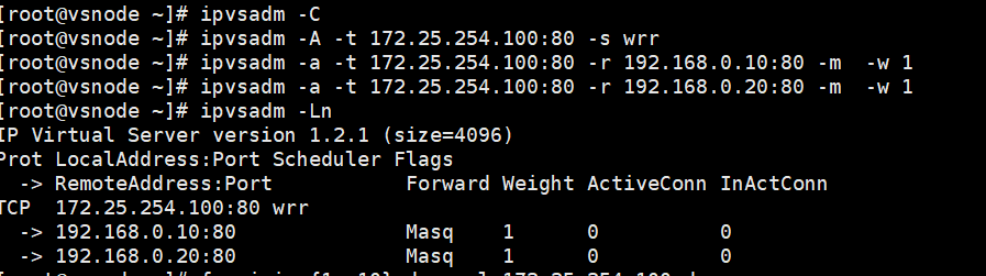 ipvsadm -a -t 172.25.254.100:80 -r 192.168.0.40 -m -w 2