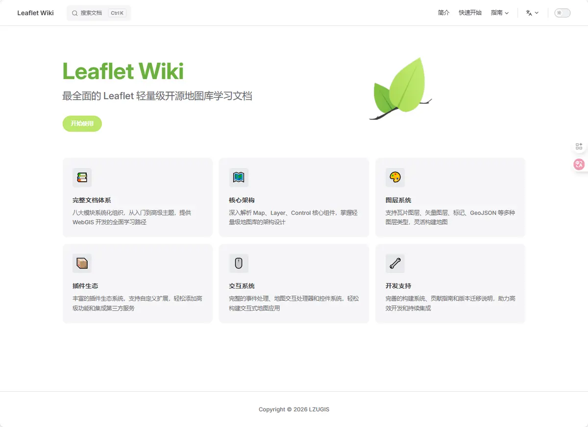 经过数月的精心筹备和开发,我们非常高兴地宣布:Leaflet WIKI 正式发布上线了!这是一个专门为 Leaflet 轻量级开源地图库打造的中文学习文档平台,旨在为开发者提供最全面、最系统、最深入的学习资源。