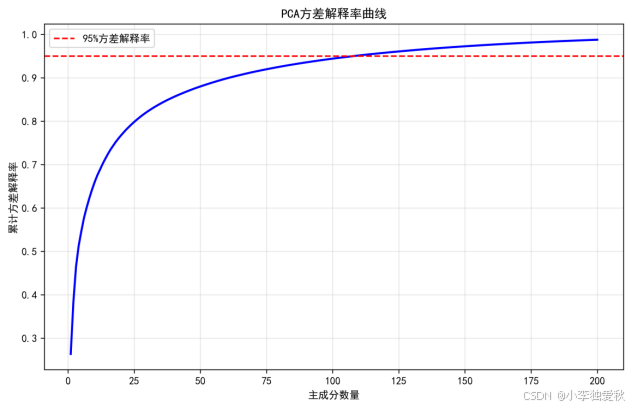 曲线显示累计方差解释率随主成分数量的增加而上升,最终趋于平稳。当主成分数量达到200时,累计方差解释率超过95%(红色虚线标出),说明200个主成分已保留大部分信息。这验证了降维的有效性:仅使用200个特征(原数据维度为4096)即可解释95%以上的方差,大幅降低了计算复杂度。