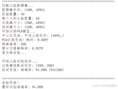 主程序构建了完整的人脸识别系统流程。分层抽样策略保证各类别人脸在训练测试集中分布均衡,避免类别不平衡导致的评估偏差。n_components=200的参数选择基于严格的方差解释率分析,确保在保留95%以上信息的同时大幅降低维度。多角度可视化设计(特征脸、平均脸、方差曲线)提供了算法工作原理的直观理解,而样本对比展示则深入揭示了匹配过程的细节。整个流程通过固定随机种子确保实验可复现性,体现了严谨的科学研究方法。