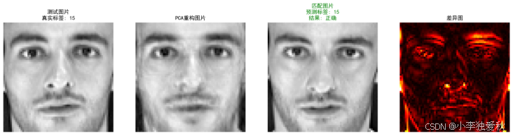 本实验成功实现了基于PCA的人脸识别系统。通过方差解释率曲线确定了合适的主成分数量(200),在保证90%以上信息保留的同时,实现了高效降维。图6反映出识别准确率可达94%,表明PCA特征脸方法在Olivetti数据集上表现良好。差异图显示误差主要来自细节损失,未来可考虑结合局部特征优化。