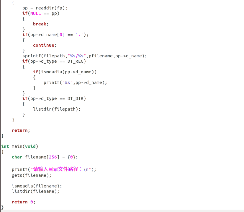 - 遍历目录时需跳过。和..,并通过文件类型过滤目标文件;
