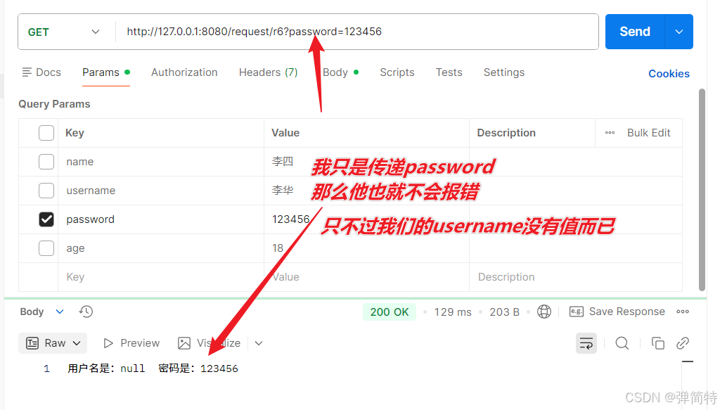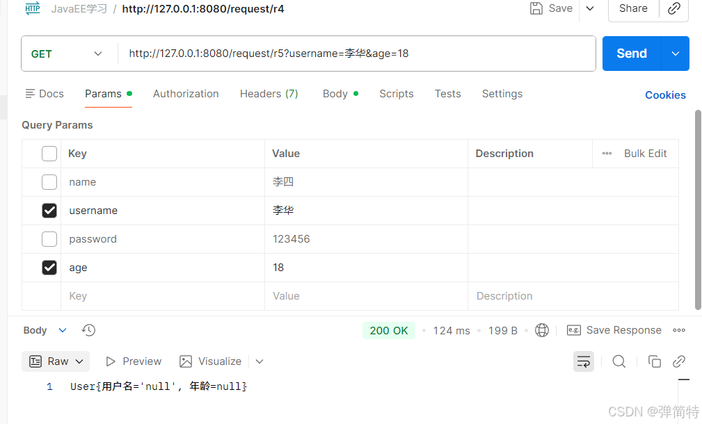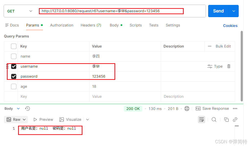 如果前端的参数和我们后端的形参名字不同的话,那么此时我们就无法取到值,于是我们username和password的值都是空的null,首先看现象