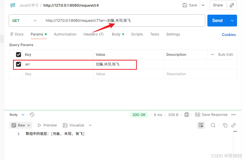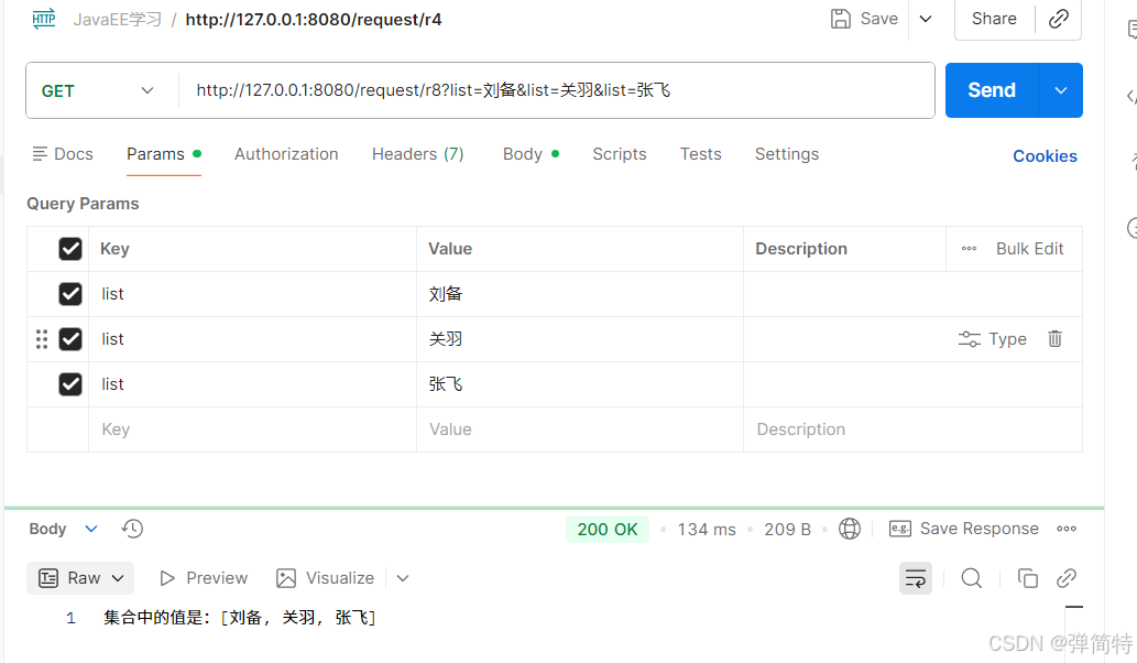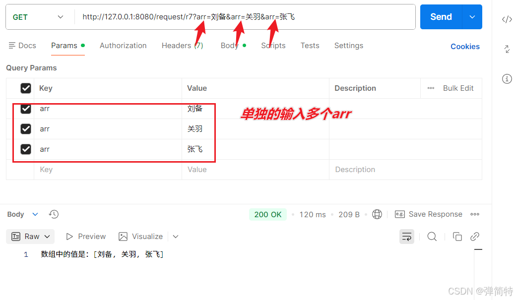 与单个参数接收方式一致,定义多个形参,前端按参数名传递即可,参数顺序不影响接收结果: