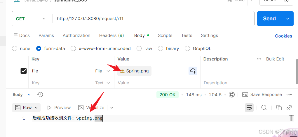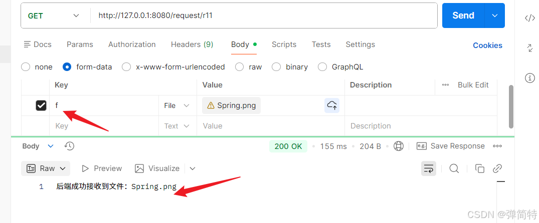 测试:使用Postman的form-data格式,key设为file(与注解中一致),选择文件上传即可。