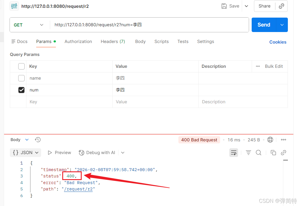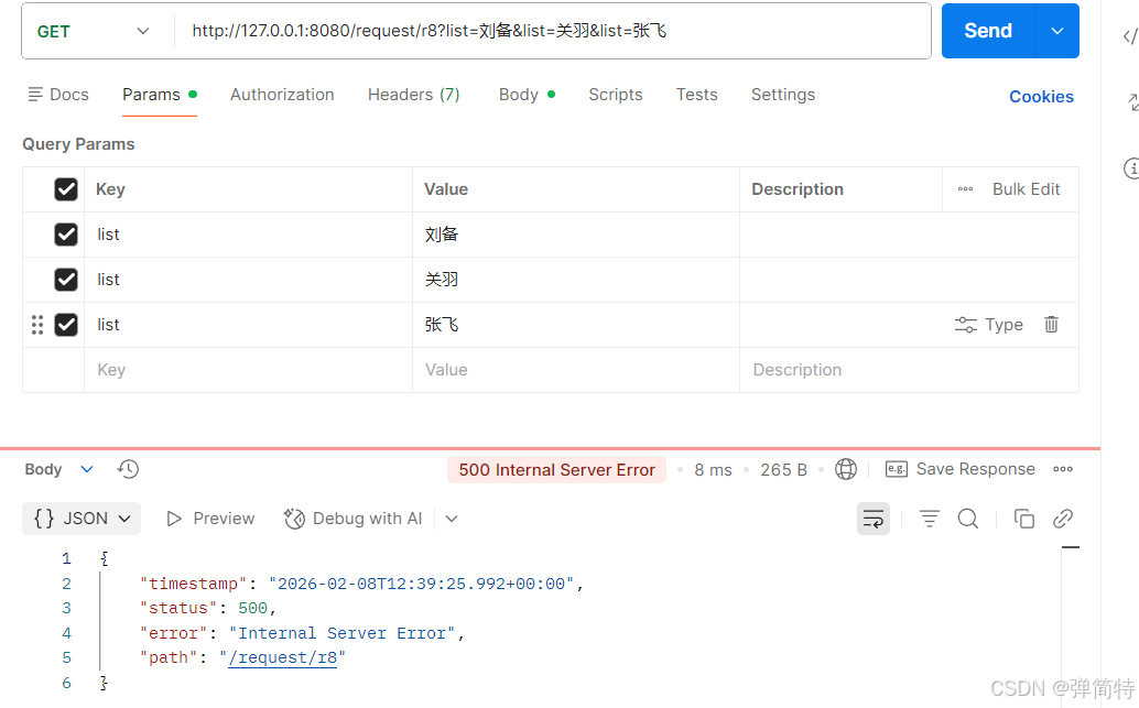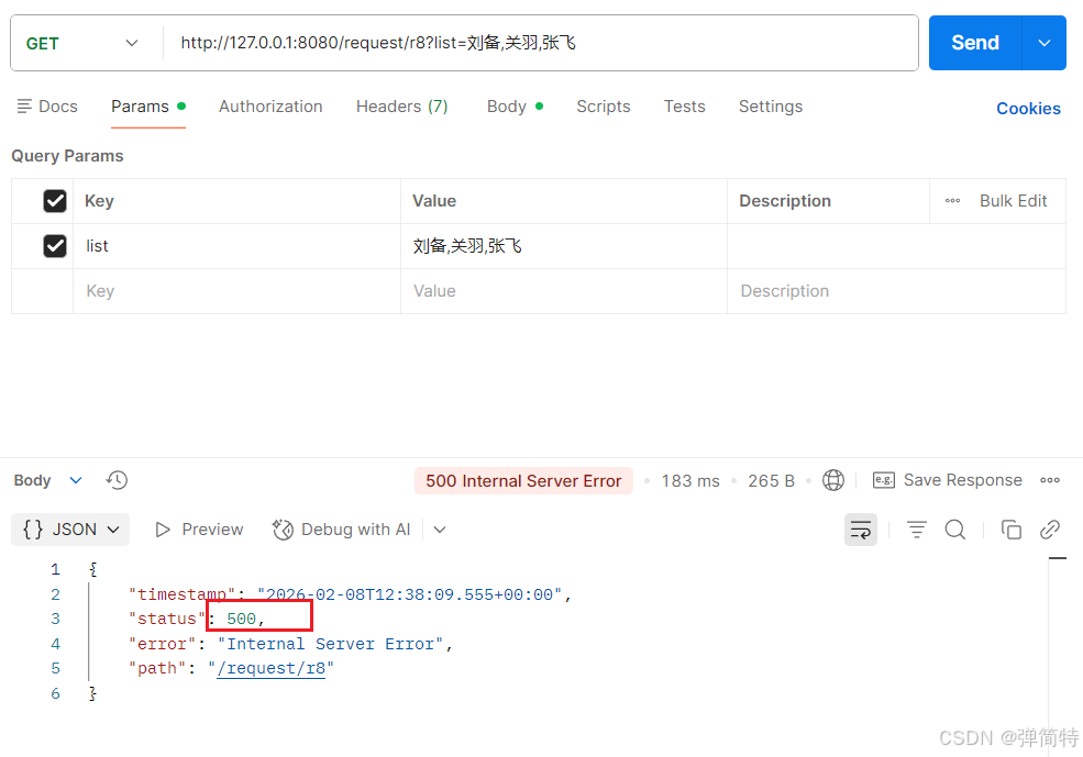 2.基本类型(除boolean外)接收参数时,参数必须传递,否则报500错误;类型不匹配时,报400错误。