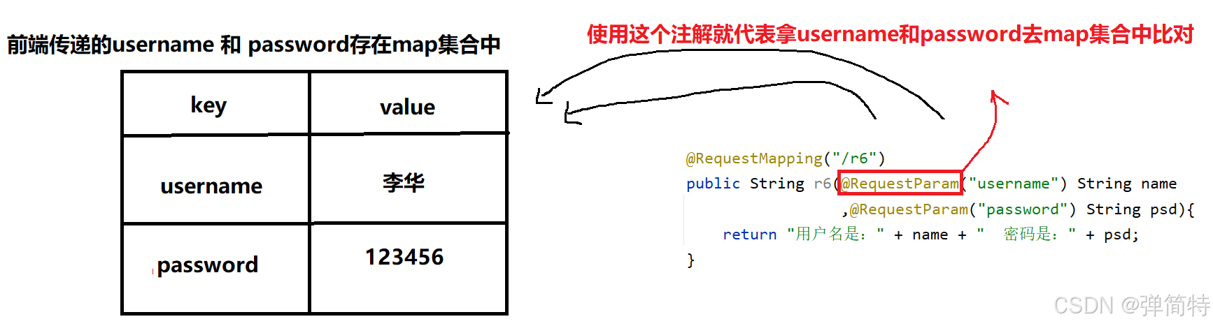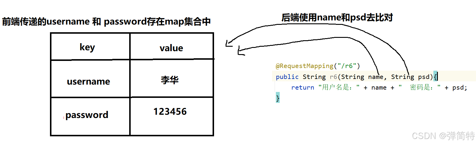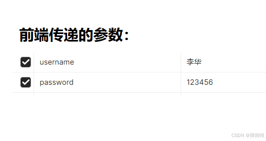 首先我的前端传递的是username和password,那么此时我们就会使用一个map集合将他存起来,然后的话,我们的后端就根据形参列表中参数名字去map集合中进行比对,如果找到了,那么就取到对应的值了。