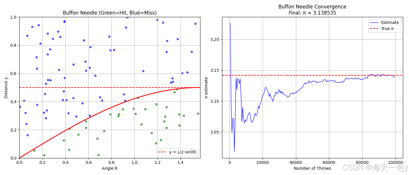 print(f"布丰投针: π ≈ {buffon_needle_pi(100000):.10f}")