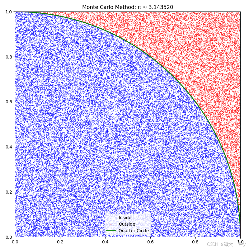 原理:在单位正方形内随机撒点,计算落在1/4圆内的比例。