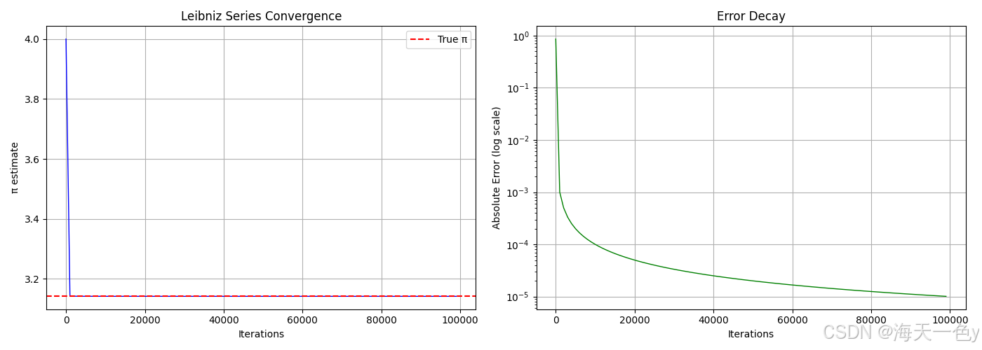 print(f"莱布尼茨级数: π ≈ {leibniz_pi(100000):.10f}")